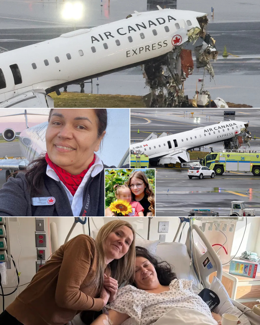 Air Canada flight attendant Sarah Tremblay, right, recovers in a hospital bed in New York after she was thrown more than 320 feet from a plane that crashed into a fire truck at LaGuardia airport
